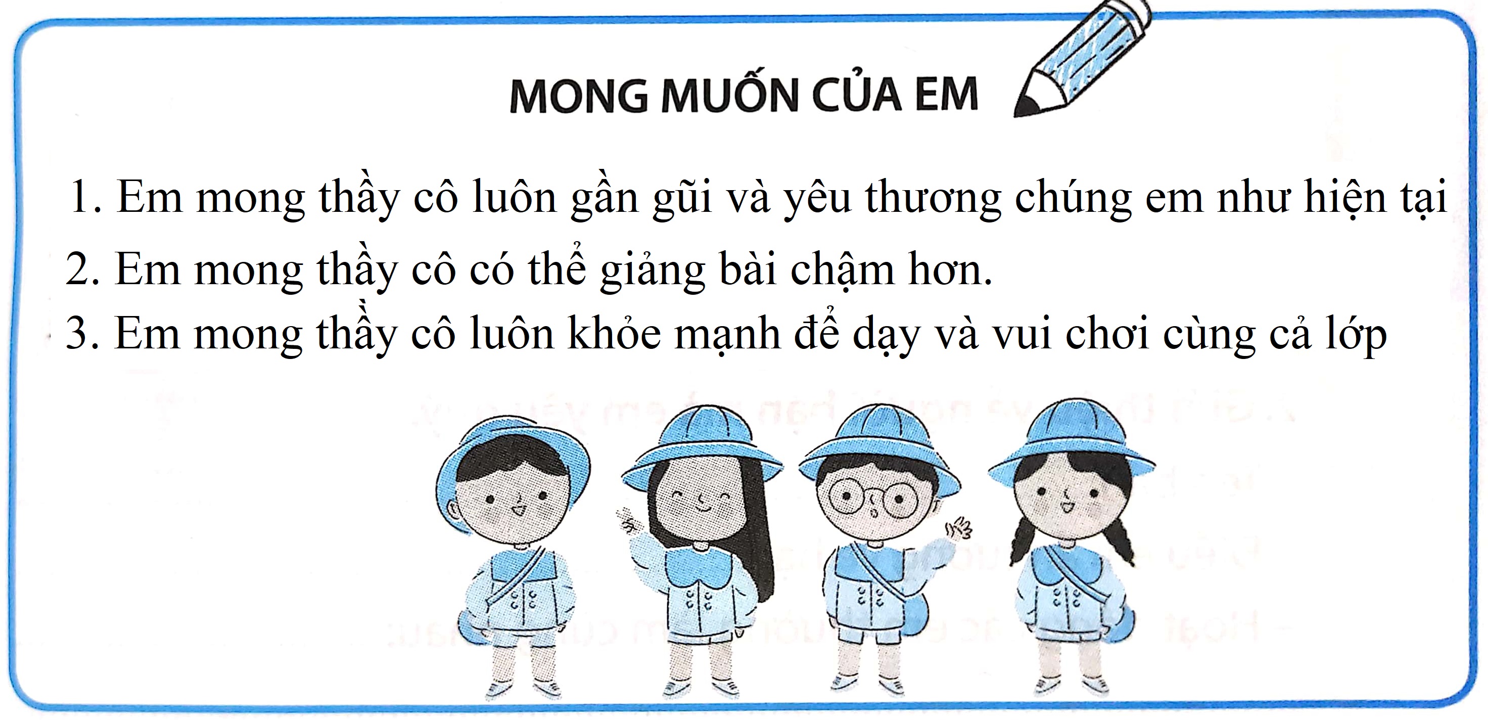 Viết 3 điều thể hiện mong muốn của em với thầy cô: