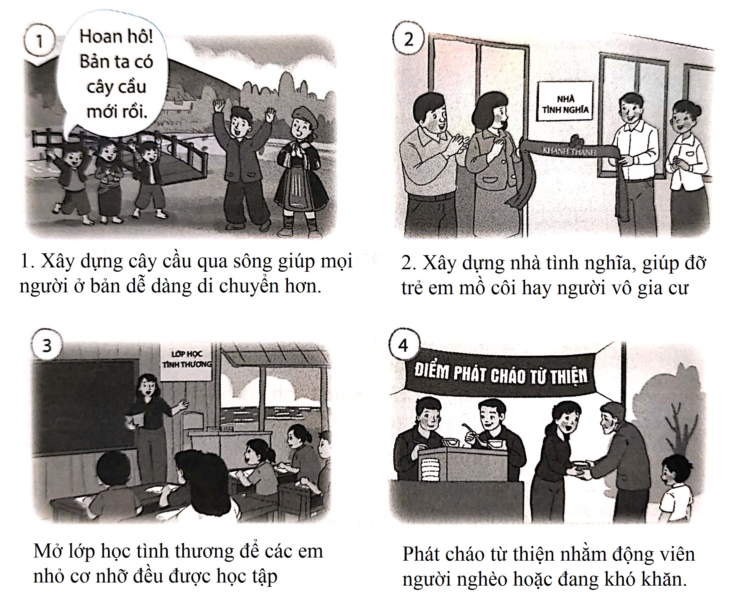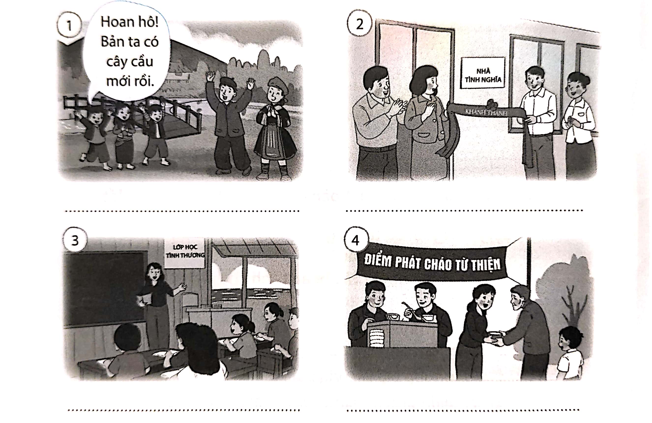 Viết dưới mỗi tranh một câu về hoạt động của cộng đồng nhằm giúp đỡ những người gặp hoàn cảnh khó khăn.