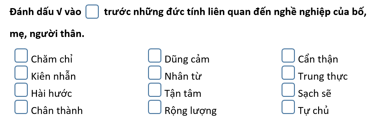 1. Đánh dấu tích vào ô vuông trước những đức tính liên quan đến nghề nghiệp người thân. 2. Theo em vì sao nghề nghiệp của bố, mẹ, người thân lại cần những đức tính đó?