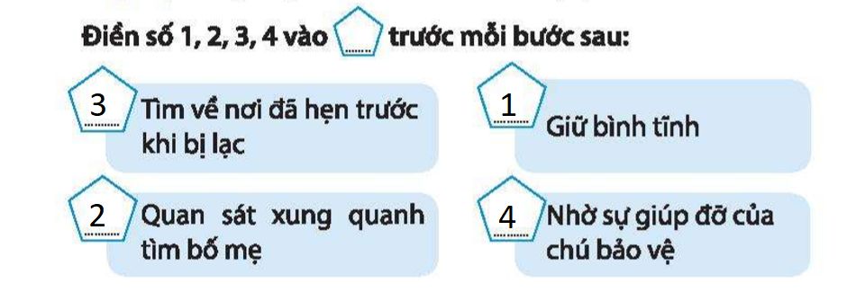 – Đầu tiên em cần đọc kĩ bước xử trí trong vở bài tập, sau đó đặt mình trong tình huống bị lạc. Nếu em bị lạc, thì trong em sẽ xử trí như thế nào? Tại sao em lại có cách xử trí như vậy?