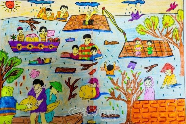 Chủ đề: Mùa lũ – lũ cuốn trôi nhà cửa, quần áo, tài sản. Mọi người giúp đỡ nhau bằng cách cứu hộ, phát lương thực, đồ dùng, áo phao,…