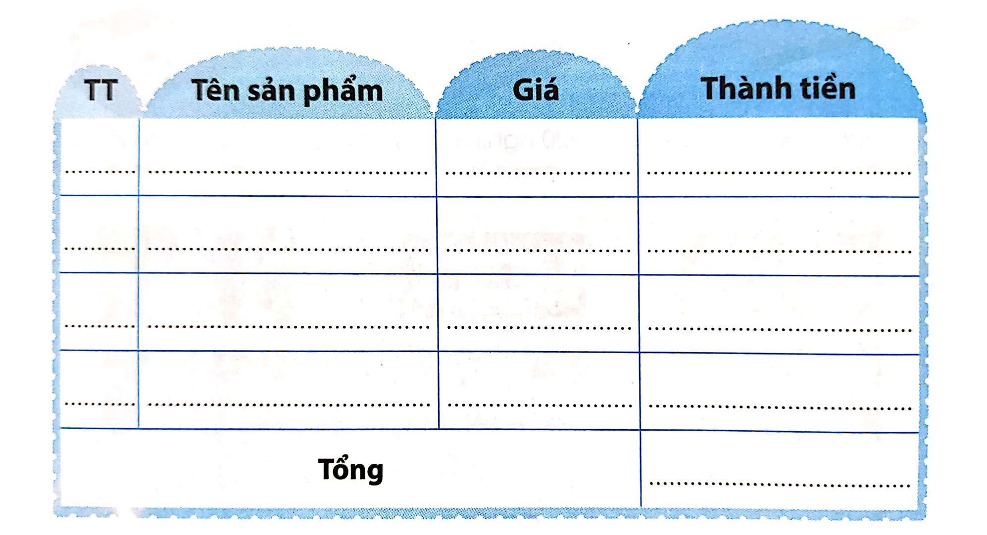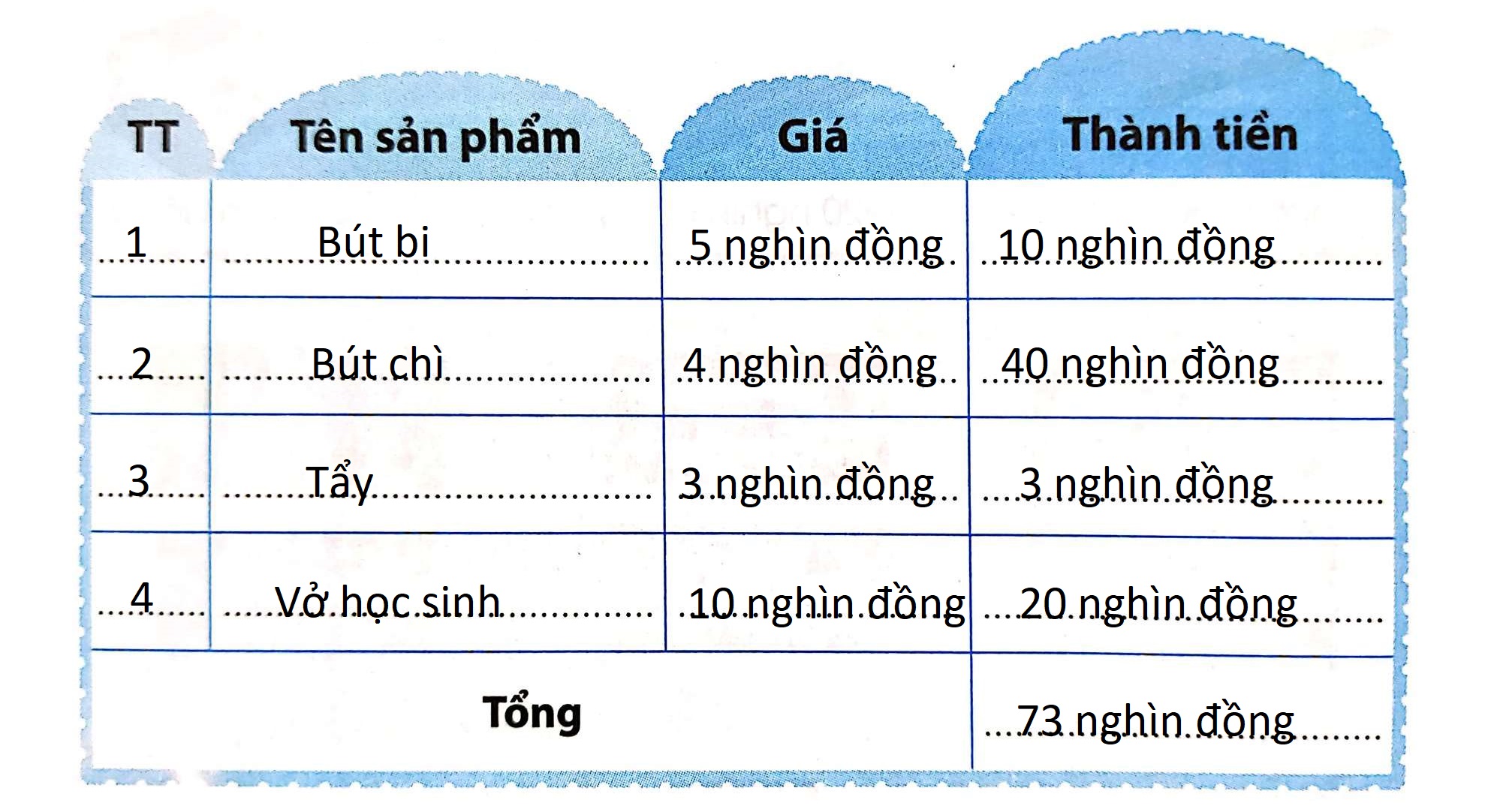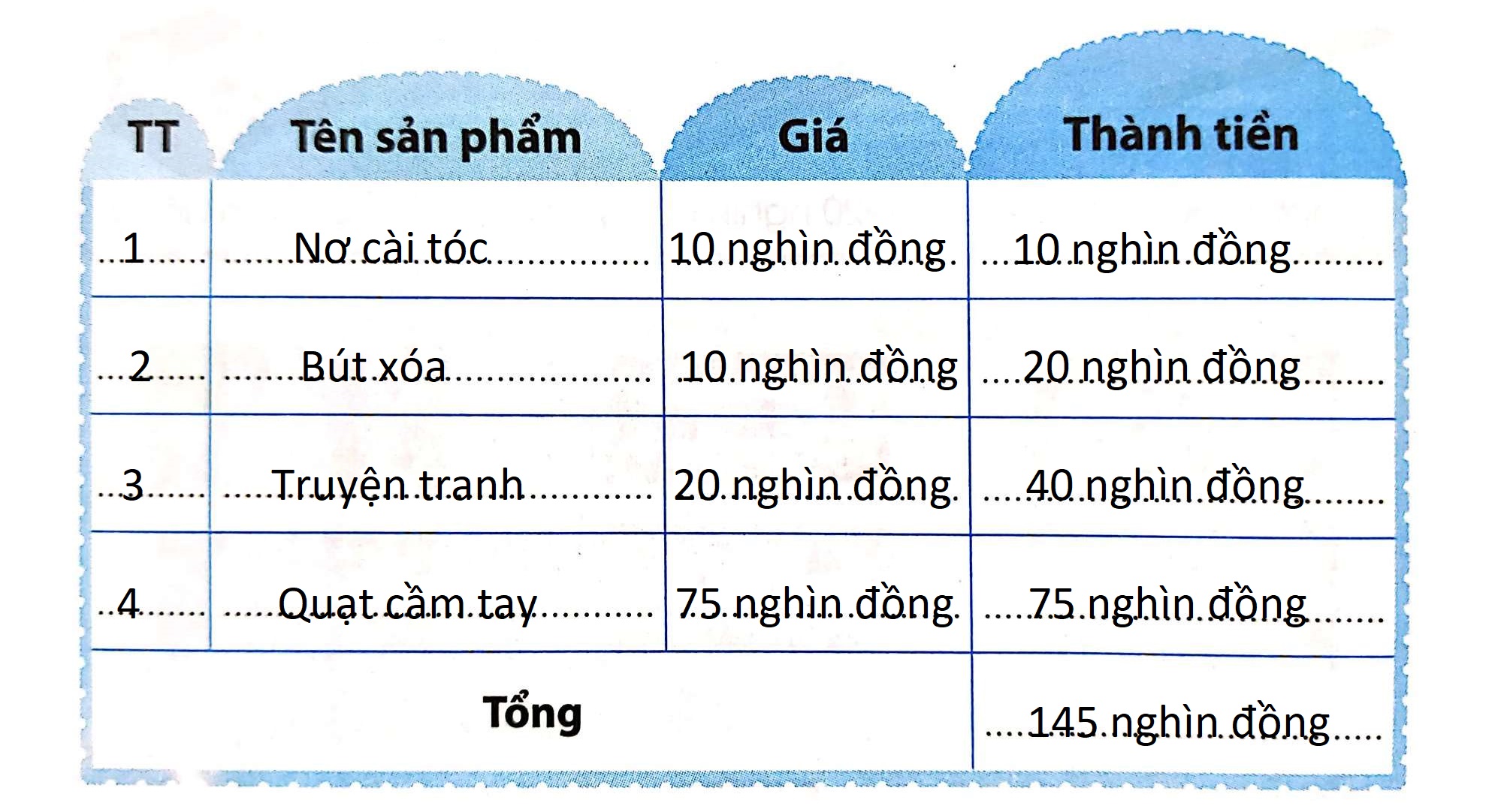 – Viết tên và giá tiền của từng món đồ mà em đã bán vào bảng.