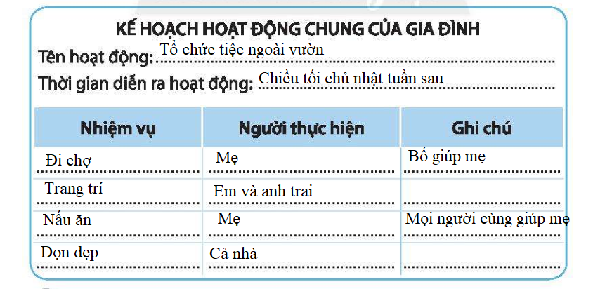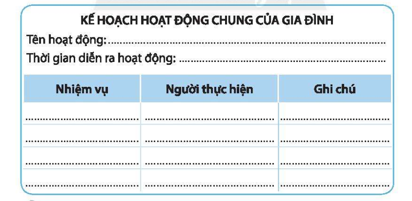 Em hãy trao đổi với các thành viên trong gia đình về kế hoạch hoạt động chung và hoàn thiện bảng sau: