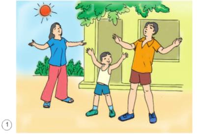 Em quan sát các bức tranh và suy nghĩ hằng ngày, con người chúng ta cần gì để duy trì sự sống. Mỗi sáng thức dậy em cần làm gì để cơ thể khỏe mạnh. Bạn nhỏ trong bức tranh đang làm gì cùng gia đình mình nhỉ?