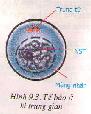 Kì trung gian là thời kì sinh trưởng của tê bào, trong đó NST ờ dạng sợi dài mảnh duỗi xoắn và diễn ra sự nhân đôi (hình 9.2, 9.3). Khi kết thúc kì này, tê bào tiến hành phân bào nguyên nhiễm (gọi tắt là nguyên phân). Trong quá trình nguyên phân, sự phân chia nhàn và phân chia chất tê bào được diễn tiến qua 4 kì: kì đầu (kì trước), kì giữa, kì sau và ki cuối như ờ bảng 9.2.