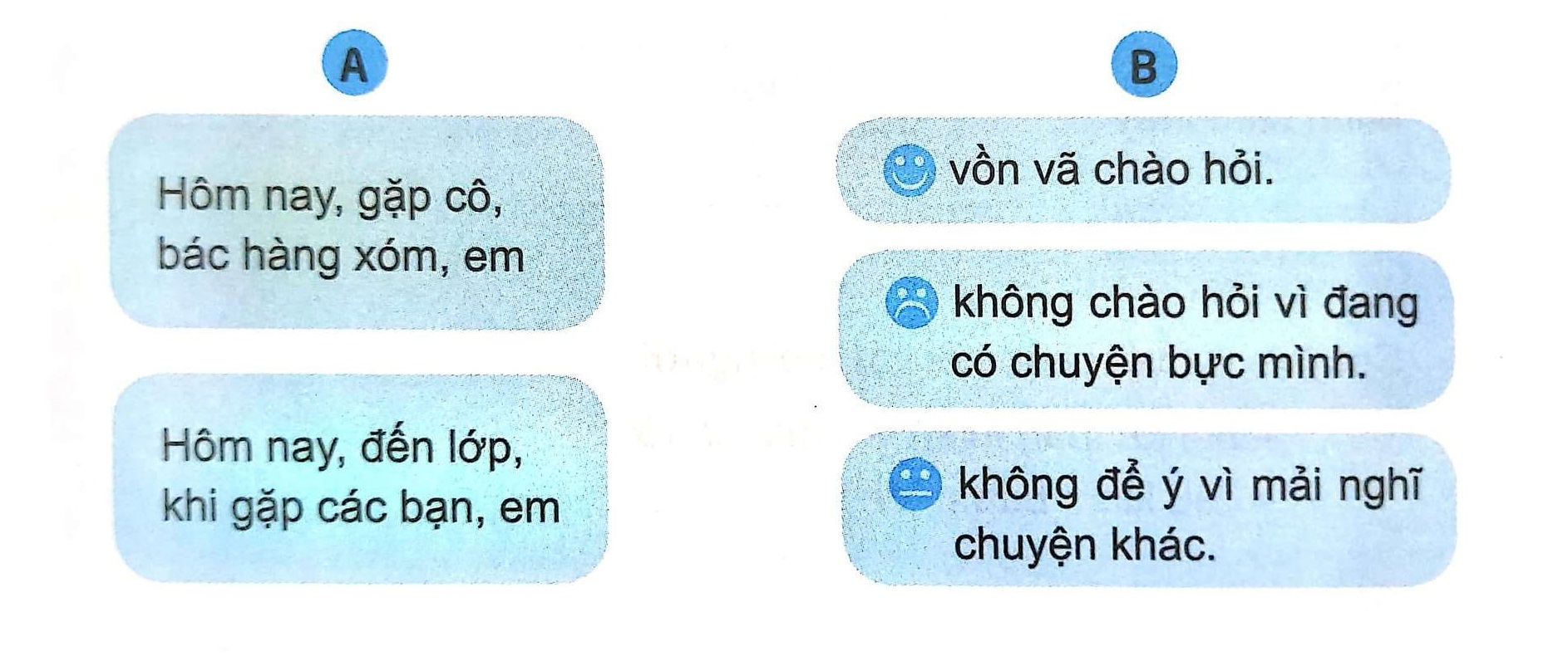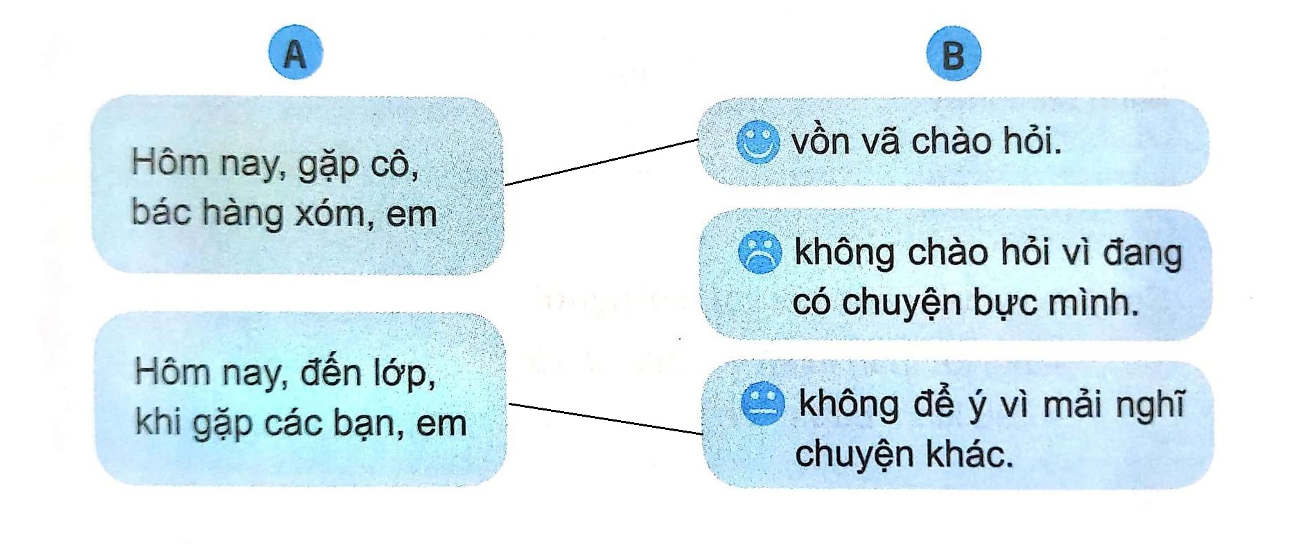 Đọc kĩ nội dung ở cột và cột B, nhớ lại những tình huống mà hôm nay em đã trải qua, sau đó nối ý A với ý B lại với nhau.