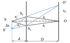 \(\begin{array}{l}{d_1}{\rm{‘ }} + {\rm{ }}{d_1} = {\rm{ }}{d_2}{\rm{‘ }} + {\rm{ }}{d_2} \to \left| {{d_1}’ – {d_2}’} \right| = \left| {{d_1} – {d_2}} \right|\\ \leftrightarrow \frac{{a\Delta x}}{d} = \frac{{{\rm{a}}{{\rm{x}}_0}}}{D} \to {x_0} = \frac{{\Delta xD}}{d}\end{array}\)
