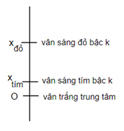 – Khi 2 vân sáng của hai bức xạ trùng nhau (vân sáng cùng màu với vân sáng trung tâm) thì: \({x_{{S_1}}} = {x_{{S_2}}} \to {k_1}\dfrac{{{\lambda _1}D}}{a} = {k_2}\dfrac{{{\lambda _2}D}}{a} \to {k_1}{\lambda _1} = {k_2}{\lambda _2}\)