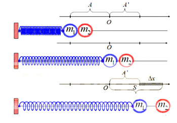 – Giai đoạn 1: Cả hai vật cùng dao động với biên độ A, tần số góc \(\omega = \sqrt {\frac{k}{{{m_1} + {m_2}}}} \)  và tốc độ cực đại v0=ωA