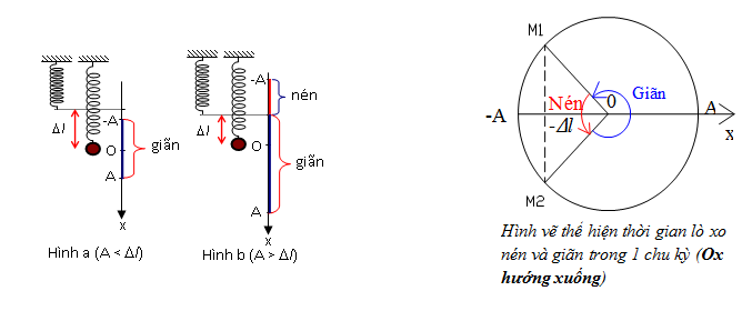 + Khi \(A < \Delta {l_0}\) : Trong quá trình dao động, lò xo chỉ bị giãn mà không có nén => Thời gian lò xo giãn = T, thời gian lò xo nén = 0
