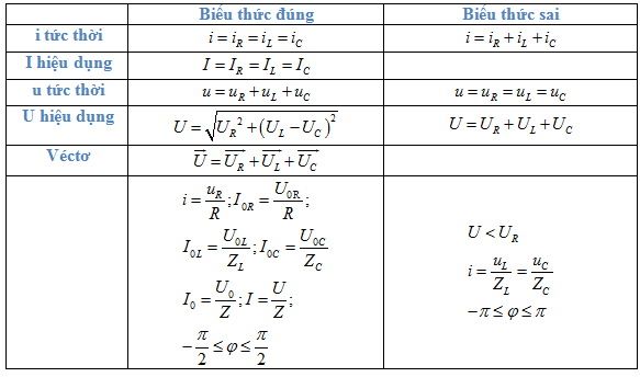 u cùng pha với i (cùng pha với uR), u chậm pha \(\frac{\pi }{2}\) so với uL, u nhanh pha \(\frac{\pi }{2}\) so với uC.