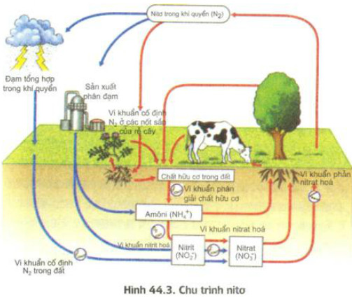 – Qua sơ đồ 44.3 em hãy mô tả ngắn gọn sự trao đổi nitơ trong tự nhiên.