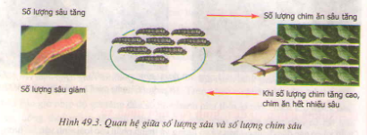 + Gặp khí hậu thuận lợi (ấm áp, độ ẩm cao, …), cây cối xanh tốt, sâu ăn lá cây sinh sản mạnh, sổ lượng sâu tăng khiến cho số lượng chim sâu cũng tăng theo. Tuy nhiên, khi số lượng chim sâu tăng quá nhiều, chim ăn nhiều sâu dẫn tới số lượng sâu lại giảm (hình 49.3).