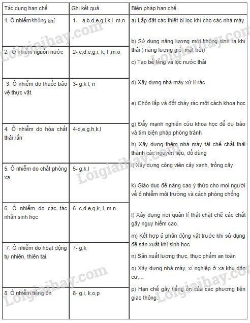 Quan sát các hình trên và liên hệ thực tế cuộc sống, sau đó chọn một hoặc một số biện pháp hạn chế ô nhiễm ở cột bên phải ( kí hiệu bằng a,b,c..) ứng với mỗi tác dụng ở cột bên trái ( kí hiệu 1,2,3…) và ghi vào cột ” Ghi kết quả” ở bảng 55.