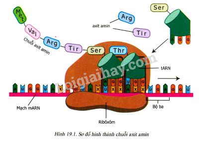 Quan sát hình 19.1 và trả lời các câu hỏi sau: Các loại nucleotit nào ở mARN và tARN liên kết với nhau?