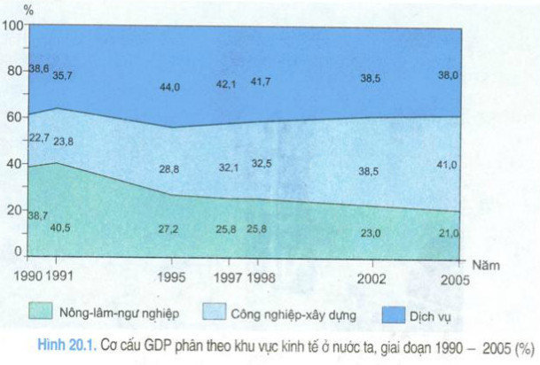 Quan sát hình 20.1, phân tích sự chuyển dịch cơ cấu GDP phân theo khu vực kinh tế ở nước ta, giai đoạn 1990 – 2005.