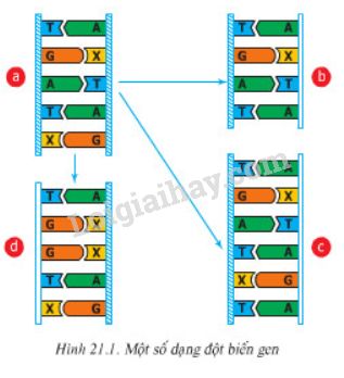 Quan sát hình 21.1 và trả lời các câu hỏi sau: Cấu trúc của đoạn gen bị biến đổi khác với cấu trúc của đoạn gen ban đầu như thế nào? Hãy đặt tên cho từng dạng biến đổi đó.