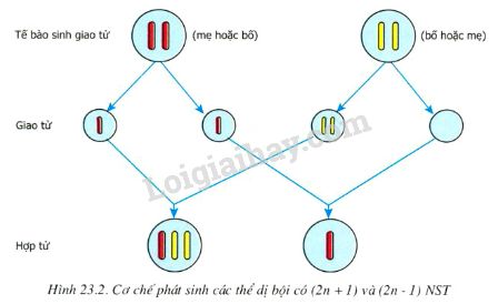 Quan sát hình 23.2 và giải thích sự hình thành các cá thể dị bội (2n+1) và (2n-1) NST