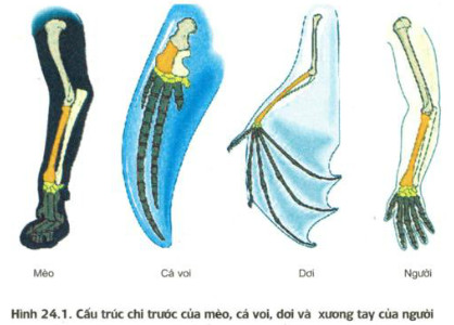 Quan sát hình 24.1 và cho biết xương chi của các loài động vật trong hình tương đồng với nhau như thể nào? Những biến đổi ở xương tay giúp mỗi loài thích nghi như thể nào?