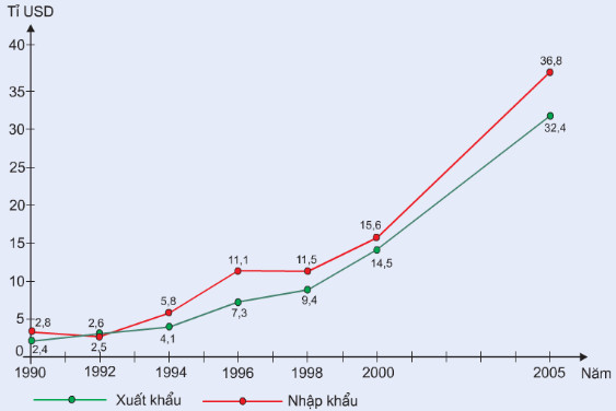 – Kim ngạch nhập khẩu nước ta tăng nhanh và liên tục trong cả giai đoạn 1990 – 2005, từ 2,8 tỉ USD lên 36,8 tỉ USD, tăng gấp 13 lần.