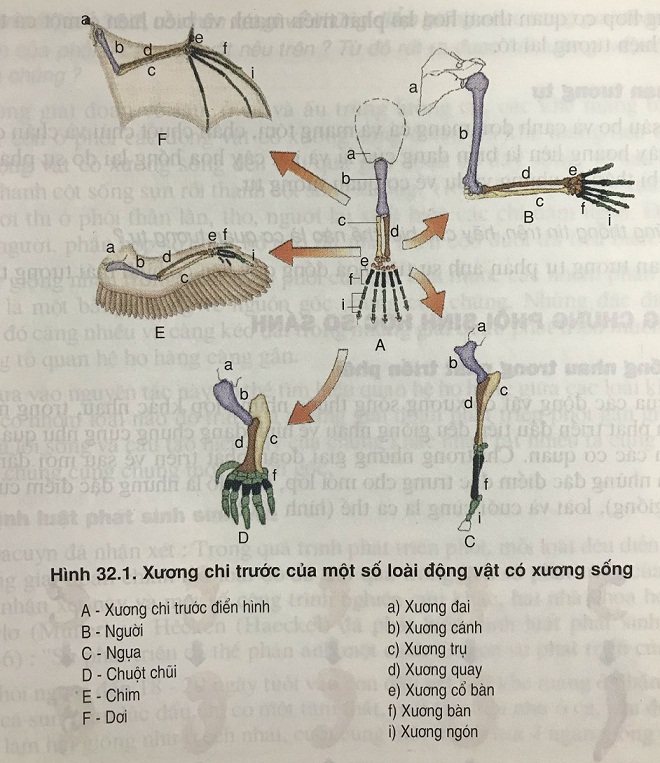 Câu hỏi trang 127 SGK Sinh 12 nâng cao: Quan sát hình 32.1: Có nhận xét gì về cấu tạo các xương chi trước của các loài? Vì sao các cơ quan tương đồng lại có những đặc điểm giống nhau?