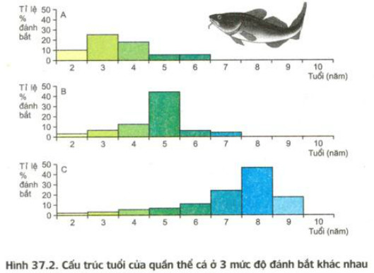Quan sát hình 37.2 và cho biết mức độ đánh bắt cá ở các quần thể A,B,C: