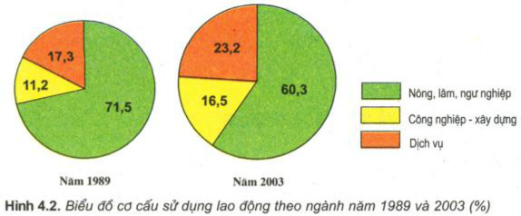 + Tỉ trọng lao động ngành công nghiệp xây dựng và dịch vụ tăng lên: công nghiệp – xây dựng tăng 5,3% (từ 11,2%  năm1989 lên  16,5% năm 2003); dịch vụ tăng 5,9% (từ 17,3%  năm 1989 lên  23,2% năm 2003).