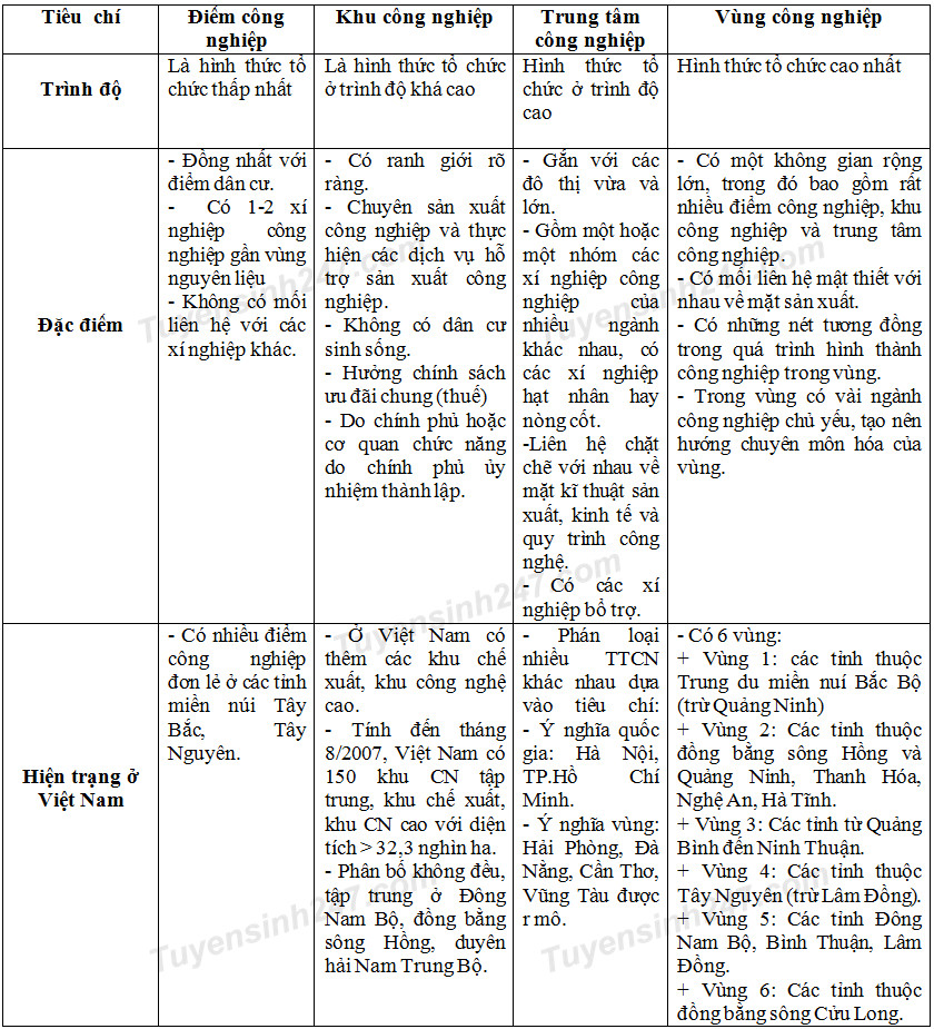 So sánh các hình thức tổ chức lãnh thổ công nghiệp ở nước ta?