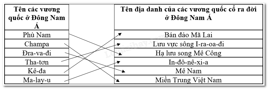 Ghép tên các vương quốc ở Đông Nam Á với tên địa danh ra đời ở cột tương ứng trong bảng dưới đây: