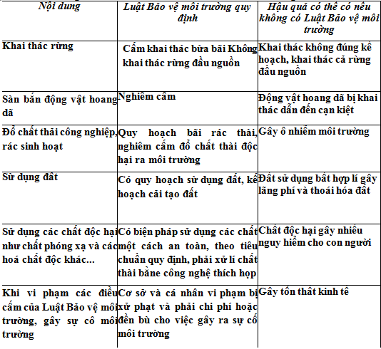 Luật Bảo vệ môi trường được ban hành nhằm điều chinh hành vi của cả xã hội để ngăn chặn, khắc phục các hậu quả xấu do hoạt động cúa con người và thiên nhiên gây ra cho môi trường tự nhiên.