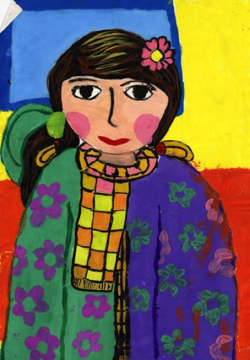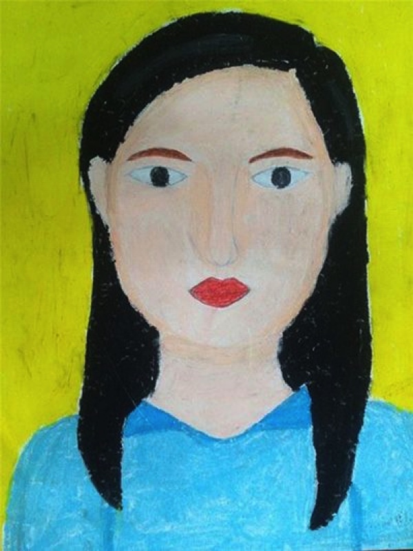 – Đây là sản phẩm của em. Em vẽ khuôn mặt nghiêm trang của cô giáo em lúc giảng bài dưới dạng chân dung, em vẽ trên giấy, dùng màu đất.