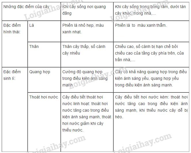 Bảng 42.1. Ảnh hưởng của ánh sáng tới hình thái và sinh lí của cây.