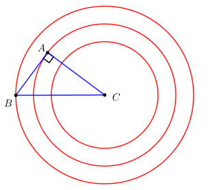Cho tam giác ABC vuông tại A có AB = 3 cm, AC = 4 cm. Từ C làm tâm vẽ các đường tròn