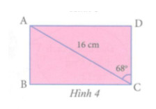 Tính hai cạnh của một hình chữ nhật khi biết một đường chéo dài 16 cm và góc giữa đường chéo và một cạnh bằng \({68^o}\) (h.4) (làm tròn đến hai chữ số thập phân).