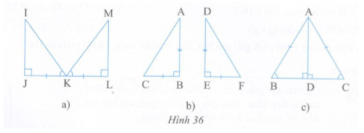 Hai tam giác vuông trong mỗi hình 36a, b, c bằng nhau theo trường hợp nào ?