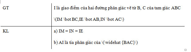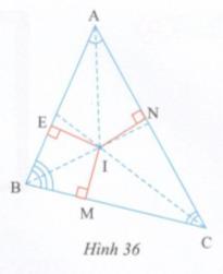 b) Ta có \(IE \bot AB,IN \bot AC\) và IE = IN => I nằm trên tia phân giác của \(\widehat {BAC}\)