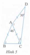 Ở hình 5, cho biết AB = AC = AD, \(\widehat {BAC} = {46^0}\)  và \(\widehat D = {30^0}.\)  Tính số đo các góc C1, B1, C2,A1