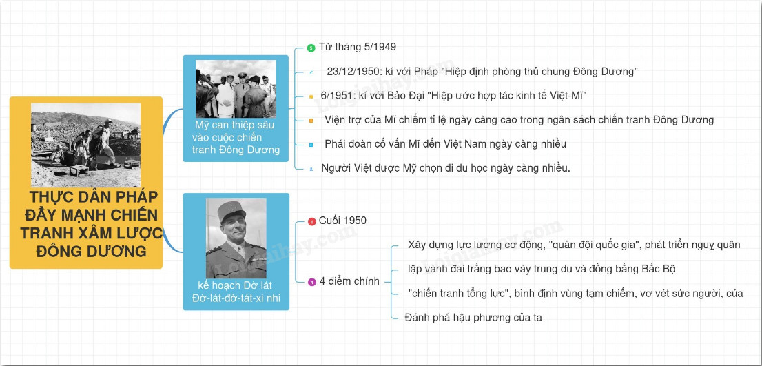 – Dựa vào viện trợ của Mĩ, cuối năm 1950, Pháp đề ra kế hoạch Đờ Lát đờ Tát-xi-nhi, mong muốn kết thúc nhanh chiến tranh. Kế hoạch có 4 điểm chính: