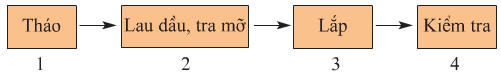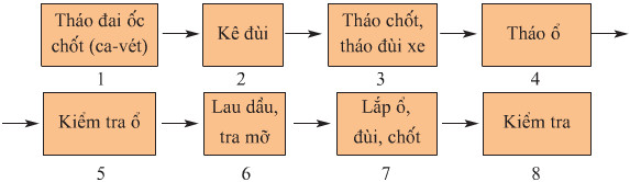 Tháo bánh xe – Tháo ổ trục – Tháo nắp mỡ, lấy bi ra ngoài – Làm sạch, lau dầu, tra mỡ,lắp bi vào ổ – Đậy nắp mỡ, lắp trục, lắp bánh xe –  Kiểm tra