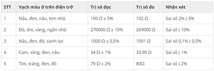 – Bước 2: Chọn ra 5 điện trở màu. Lần lượt lấy ra từng điện trở để đọc trị số và đo trị số bằng đồng hồ, sau đó điền vào bảng 1.