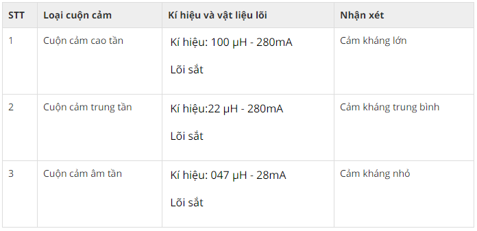 – Bước 3: Chọn 3 loại cuộn cảm khác nhau về vật liệu làm lõi và cách quấn dây quấn rồi điền vào bảng 2.