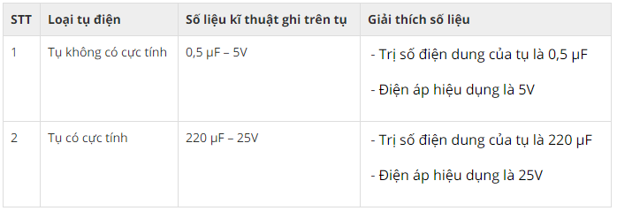 – Bước 4: Chon ra 1 tụ điện có cực tính và 1 tụ điện không có cực tính để ghi các số liệu kĩ thuật của từng tụ điện, sau đó điền vào bảng 3.