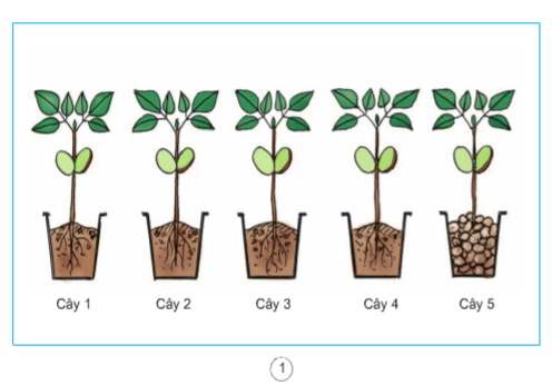 Có năm cây đậu như hình vẽ. Bốn cây được trồng trong chậu có chứa đất màu (đất trồng có chứa chất khoáng) như nhau. Một cây được trồng trong một chậu sỏi đã được rửa sạch.