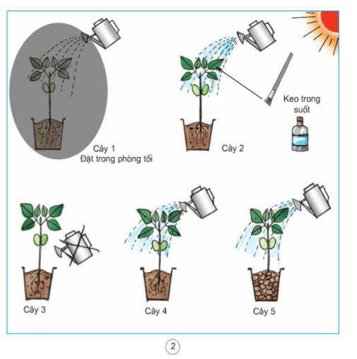 Cây 2 : Để nơi có ánh sáng, tưới nước thường xuyên, nhưng bôi một lớp keo mỏng, trong suốt lên hai mặt lá nhằm ngăn cản sự trao đổi khí của lá.