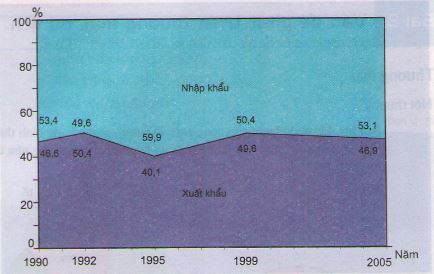 Hình 31.2. Cơ cấu giá trị xuất, nhập khẩu của nước ta giai đoạn 1990-2005 (%)