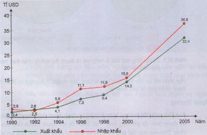 Hình 31.3. Giá trị xuất, nhập khẩu của nước ta, giai đoạn 1990-2005