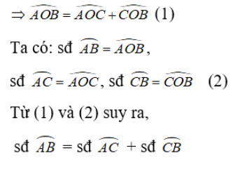 Hãy chứng minh đẳng thức \( sđ \overparen {AB}=sđ \overparen {AC}+sđ \overparen {CB}\) trong trường hợp điểm C nằm trên cung nhỏ AB (h.3).