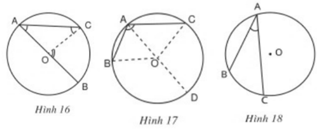Bằng dụng cụ, hãy so sánh số đo của góc nội tiếp ∠(BAC) với số đo của cung bị chắn BC trong mỗi hình 16, 17, 18 dưới đây.