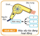 Hình 48.3 mô tả một máy sấy tóc đang hoạt động. Mũi tên trên sơ đồ dòng năng lượng cho thấy sự chuyển hóa điện năng thành ba dạng năng lượng khác.