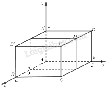 Vậy \(\overrightarrow {AB}  = \left( {a;0;0} \right),\) \(\overrightarrow {AC}  = \left( {a;b;0} \right),\) \(\overrightarrow {AC’}  = \left( {a;b;c} \right)\), \(\overrightarrow {AM}  = \left( {\dfrac{a}{2};b;c} \right)\).